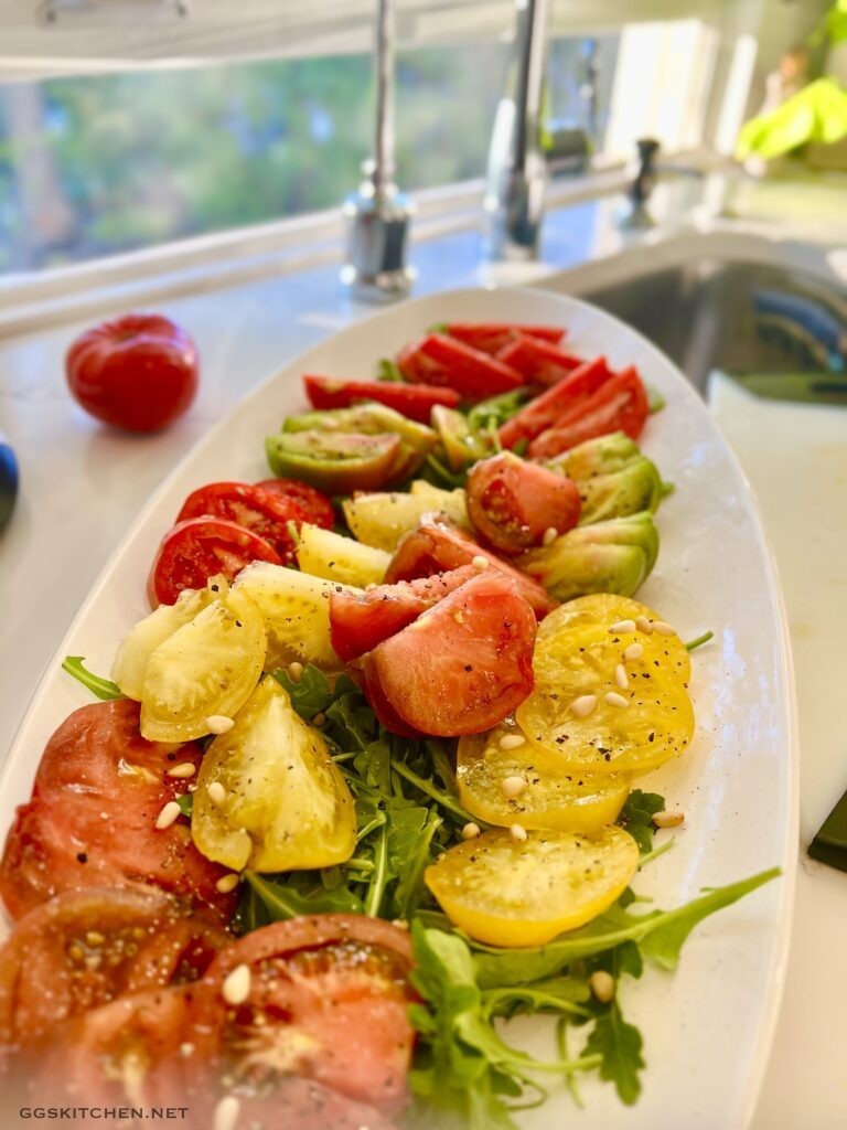 Now to be sure, you can certainly make this with regular tomatoes, but the varied colors and shapes of the heirlooms make for a beautiful platter and presentation. It’s simple, requires no cooking, is a terrific addition to any dinner, takes minutes to put together and is absolute tomato heaven!